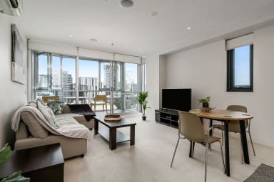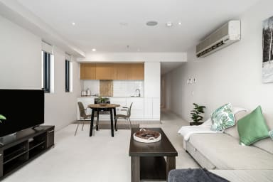 Next to a private balcony, the wrap-around living area comprises of a sleek kitchen fitted with quality fixtures and stainless steel appliances, a cozy dining nook, and a comfortable lounge room dressed with sophisticated furnishings.